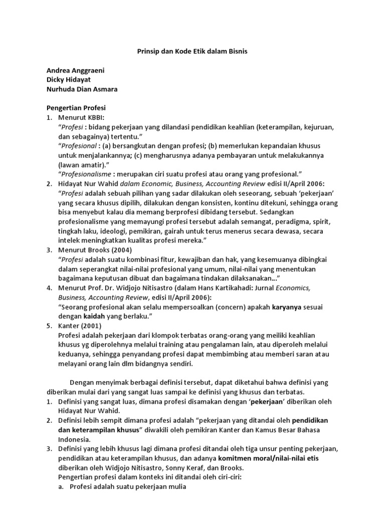 Etika bisnis dan kewirausahaannorma dan etika bisnismenurut zimmerer (1996:20), etika bisnis adalah suatu kode etik perilaku semua kelompok kepentingan baik secara internal maupun eksternal oleh zimmerer ditunjukkan pada gambar. Di dalam melakukan bisnis, kita wajib untuk memperhatikan etika agar di pandang sebagai bisnis yang baik. Kode etik praktisi humas meliputi. Makalah ini dibuat untuk memenuhi tugas mata kuliah. Disinilah peranan kode etik diperlukan untuk melarang beberapa tindakan tertentu yang akan membawa para perilaku ke dalam dilema.